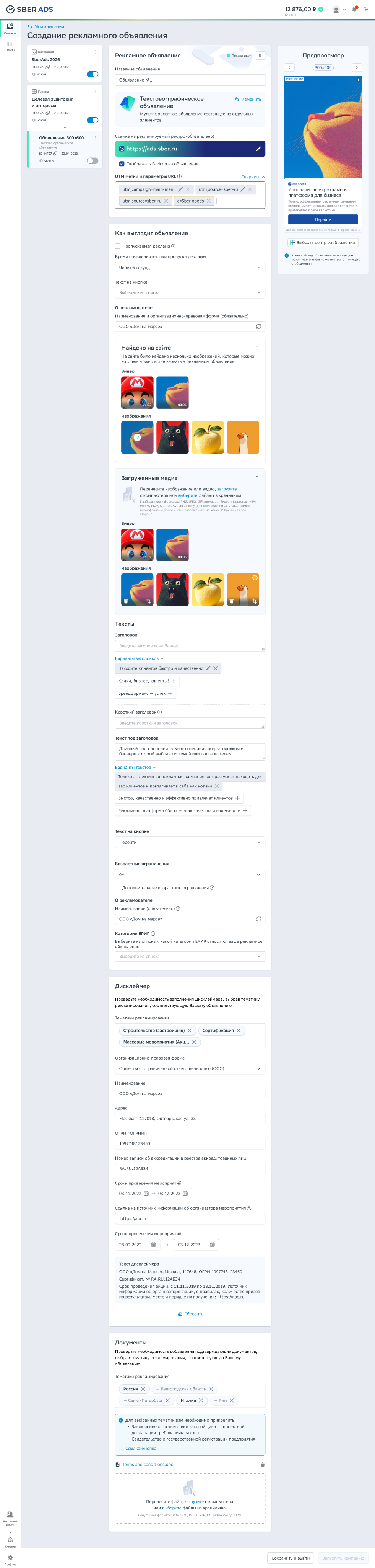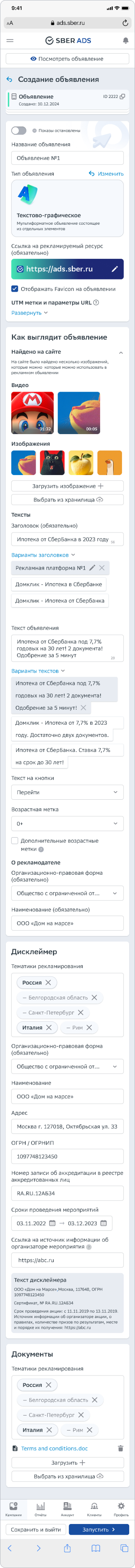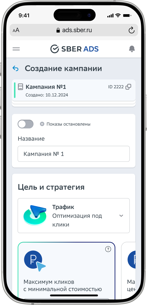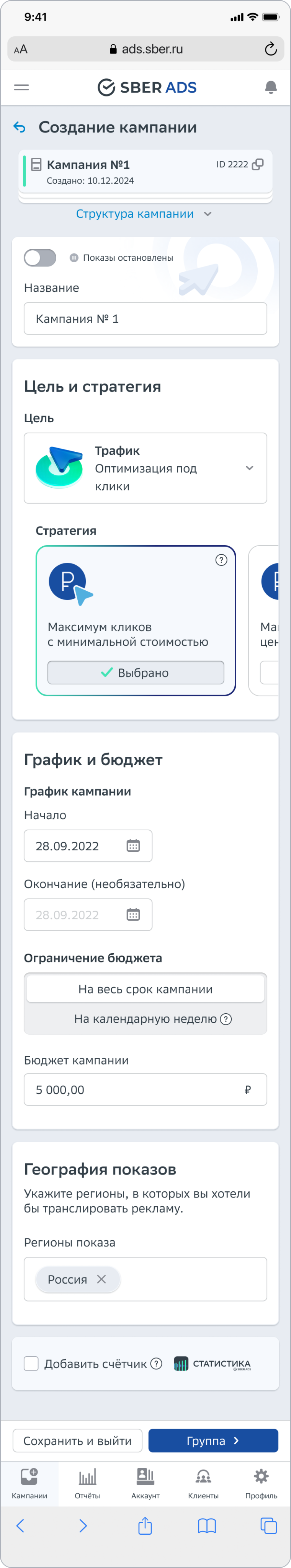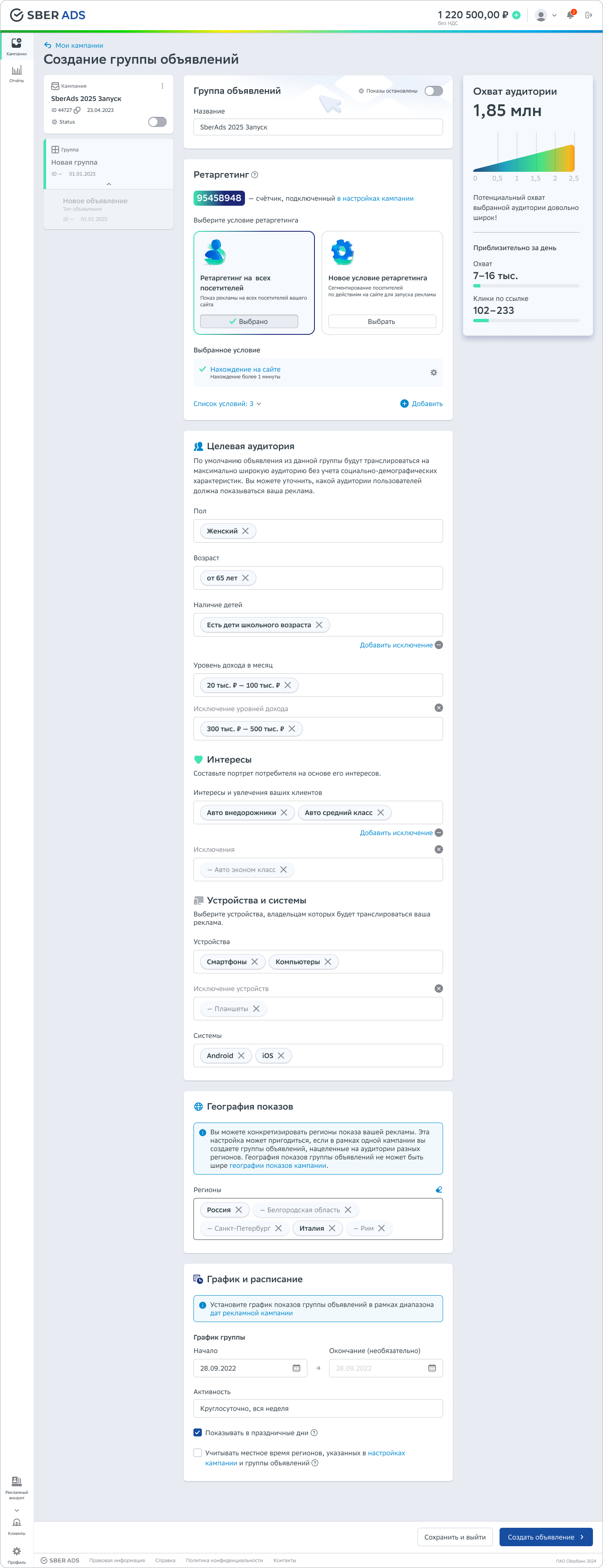 UX-дизайн структуры шагов: Кампания → Группа → Объявление, была запатентована Сбер RND в Роспатенте, не имеет аналогов, признана наиболее оптимальной на рынке рекламных платформ и получила высокую оценку от агентств