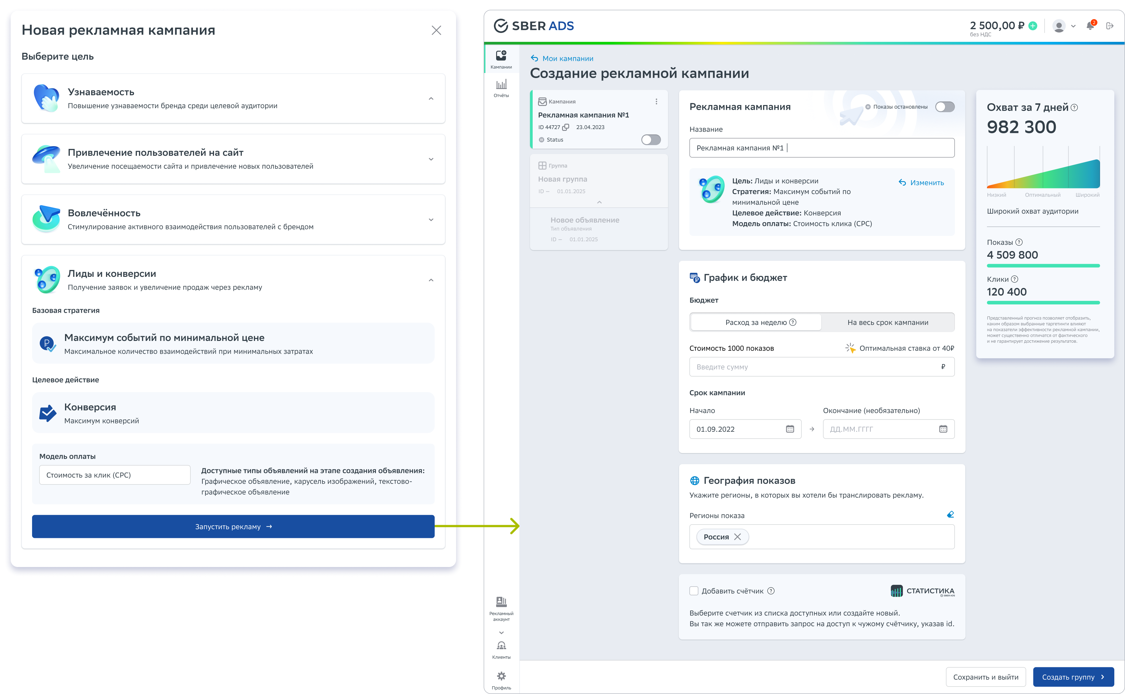 Через расширенную форму в модальном окне, выбирается цель, после чего происходит переход к 3-шаговой форме настройки и обладает живым прогнозированием охвата с расширенными показателями