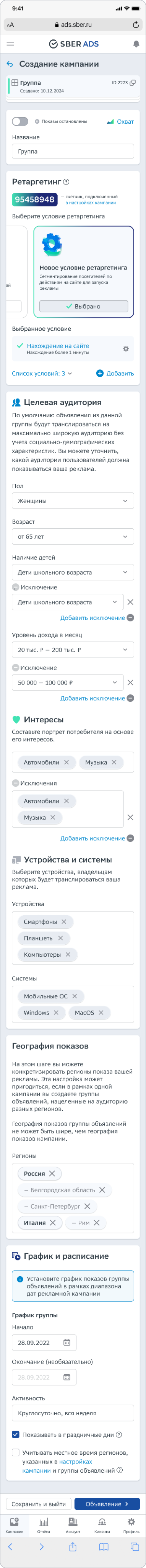 Стандартный набор параметров + настройка ретаргетинга и исключений в аудитории